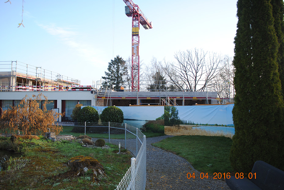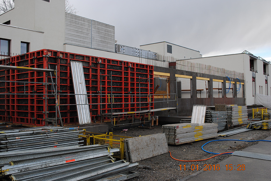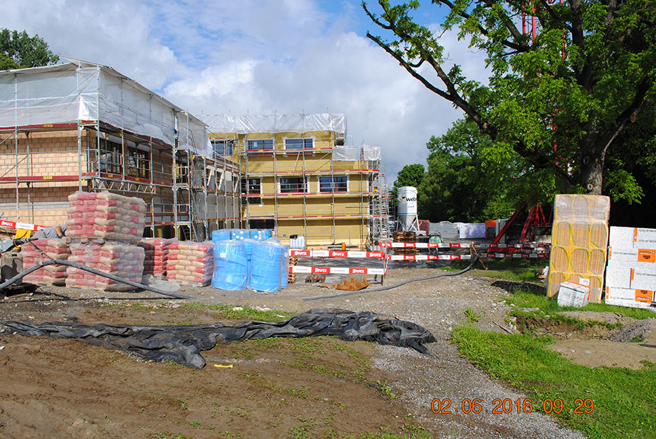 Zur Zeit wird auf der Südseite die neue Gartenanlage angelegt und auf der Westseite sind die Bauarbeiten für eine Feuertreppe in vollem Gange.